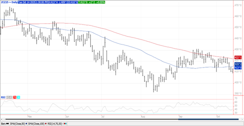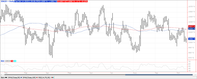 Prices were $.01 – $.02 higher closing near session highs. Spreads also firmed. For now at least, Dec-25 has rejected trade into new lows for the month. Next resistance is the 50 day MA at $4.15 ¼. A Reuters poll suggests corn harvest has reached 44% as of this past Sunday, down slightly from the 47% pace from YA. Export inspections at 44 mil. bu. were a MY low and below expectations. They were also below the 57 mil. needed per week to reach the USDA forecast. Last week’s inspections however were revised up by 4 mil. bu. bring YTD inspections to 313 mil. up 65% from YA vs. the USDA forecast of up 5%. The only noted buyers were Mexico – 12 mil. and Colombia – 8 mil. Conab is forecasting Brazil’s 2025/26 corn production at 138.6 mmt, slightly above their preliminary forecast of 138.3 however below expectations. They forecast plantings will reach 22.69 mil. HA, up 3.8% YOY with export reaching 46.5 mmt. Conab’s forecast is well above the USDA production est. of 131 mmt, and exports at 43 mmt. EU 25/26 imports as of Oct. 12th at 4.33 mmt are down 27.4% YOY.