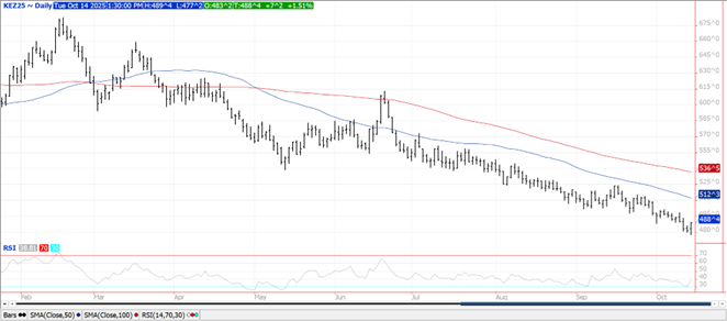 Prices ranged from $.02-$.07 higher with most contracts closing near session highs. All classes were able to shake off early weakness while both Dec-25 CGO and KC fell to 5 year lows on their respective monthly charts. Dec-25 KC close above yesterday’s high carving out a key reversal day. Dec-25 CGO just missed out on a key reversal. Export inspections at 16 mil. bu. were in line with expectations and above the 15 mil. bu. needed per week to reach the USDA forecast. YTD inspections at 392 mil. bu. are up 18% from YA, vs. the USDA forecast of up 9%. Jordan reportedly bought 60k mt of optional origin milling wheat at $262.50/mt CF for Feb-26 delivery. Conab raised their Brazilian production forecast 2% to 7.7 mmt, just above the USDA est. of 7.5 mmt. EU soft wheat exports as of Oct. 12th at 5.51 mmt are down 22.6% from YA