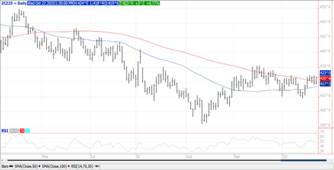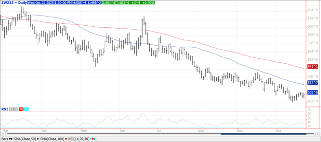 Prices were $.02-$.03 higher today with spreads also firming. The Dec-25/Mch-26 spread jumped out to a 6 month high at -$.12 1/2. Inside trade for Dec-25 futures having held support at yesterday’s low in overnight trade. US rains over the balance of the week will favor the S. plains and SW Midwest. Light totals around the Great Lakes region with the NW mostly dry until early next week. Ethanol production jumped to 1,112 tbd, or 327 mil. gallons in the week ended Fri. Oct. 17th, up from 316 mil. the previous week and up 3% from YA. Production was above expectations and a new MY high. There was 111 mil. bu. of corn used in the production process, or 15.8 mil. bu. per day, well above the 15.4 mbd needed to reach the USDA corn usage estimate of 5.60 bil. bu. In the MY to date there has been 710 mil. bu. used, or 15.1 mbd, an annualized pace of 5.511 bil. Despite the higher than expected production, ethanol stocks fell to 21.9 mil. barrels, below expectations and below YA at 22.2 mb. Implied gasoline usage was flat at 8.454 tbd however down 4.3% from YA.