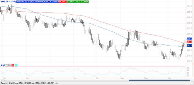 Prices were mixed across the complex. Beans were $.04 higher in spot Nov-25 while deferred contracts were off $.01-$.02, meal was $1-$3 higher while oil slipped 50-60 points. Bean and meal spreads firmed while oil spreads weakened with several making new lows. Today’s high in Nov-25 beans has matched yesterday’s high at $10.38 with next resistance at the Sept. high at $10.53. Dec-25 meal surged thru its 100 day MA closing at a 2 month high. The next major resistance not until the Aug-25 high near $300 ton. Dec-25 oil briefly traded under $.50 lbs. before recovering to close just above it. Spot board crush margins slipped another $.03 ½ to $1.54 bu. with bean oil PV falling to its lowest level in nearly 5 months at 46.3%. Helping tilt prices higher were wire service reports that Japan’s new PM will offer to purchase US soybeans, natural gas and pickup trucks at next week’s meeting with Pres. Trump in exchange for lower US tariffs on Japanese vehicles. Yesterday the Trump Admin. announced they would reopen the FSA portion of the USDA while also distributing $3 bil. in aid to farmers hurt by China’s boycott of American soybeans. The Brazilian oilseed industry group ABIOVE is forecasting 2025/26 production at 178.5 mmt, above the USDA forecast of 175 mmt. ABIOVE projects Brazilian exports at 111 mmt, just below the USDA forecast of 112 mmt. Farmers continue to hold on to as much of this year’s harvest as they can, hoping for a favorable outcome in the upcoming US/China trade talks. As harvest advances however storage is becoming increasingly scarce. Markets remain hopeful that perhaps there is a scenario where the US captures a portion of the 300-350 mil. bu. of anticipated Chinese demand for the Dec/Jan timeframe.
