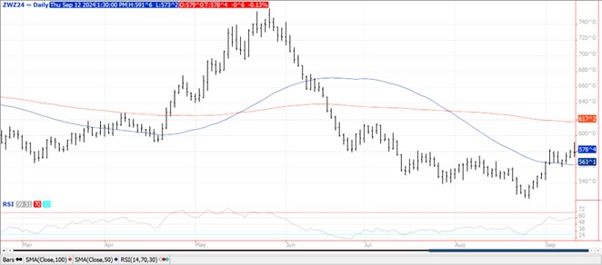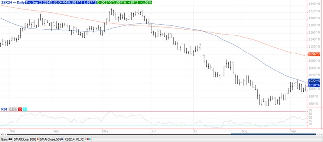 The soybean complex was higher with beans up $.09-$.11, meal was $3 higher while oil was up 40-55. An initial rally in Nov-24 soybeans stopped just shy of this week’s high at $10.20 before backing off. Inside day for Oct-24 oil closing back above $.40 lb. Oct-24 meal held support above its 50 day MA at $313.60. Next resistance is the September high at $328.50. US production was cut 3 mil. bu. to 4.586 bil. nearly 25 mil. below expectations. Record yields were left unchanged at 53.2 bpa. Old crop stocks were cut 5 mil. to 340 mil. in line with expectations as a result of higher crush. New crop stocks were cut 10 mil. bu. to 550 mil., roughly 35 mil. below expectations. The USDA raised the amount of bean oil used in biofuel production by 100 mil. lbs. to 13.0 bil., right back where it was in July. Global stocks were little changed at 134.6 mmt, in line with expectations. Chinese imports were left at 111.5 mmt for 2023/24 and 109 mmt for 2024/25. Weekly exports at 54 mil. bu. were in line with expectations and bring 2024/25 commitments to 523 mil. down 14% from YA vs. the USDA forecast of up 2%. Commitments are the lowest in 5 years. Shipments are down 23%. China/unknown combined to buy 40 mil. bu. I look for the USDA to raise 23/24 exports 10 mil. bu. to 1.710 bil. Conab left their 23/24 Brazilian production forecast unchanged at 147.4 mmt. They will provide their 1st 24/25 production forecasts in Oct-24. Abiove lowered their 23/24 soybean forecast .2 mmt to 153 mmt, in line with the USDA. Hurricane Francine made landfall last night in LA. The center of the storm has moved north into MS and the Delta region today. Only minor production damage to soybeans is expected. Cumulative rains of 2-8” were felt in LA with 1-4” totals more common in the rest of the Delta, SE and southern Midwest. Little moisture is expected west of the Mississippi river. Above normal temperatures and little rain this week across much of the WCB and NC Midwest will continue to push corn and soybean crop toward maturity. Outside of some scattered rains for southern Brazil much of SA crop areas will remain dry over the next 7-10 days.