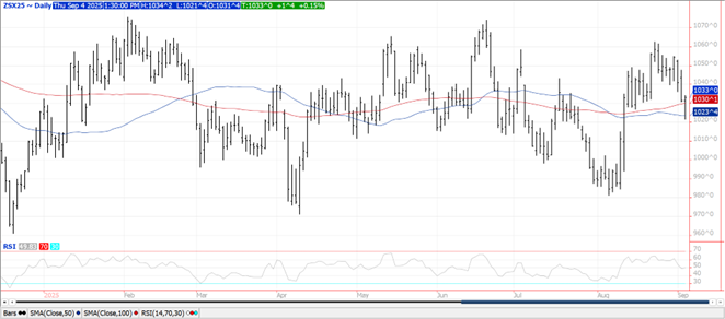 Prices finished $.01-$.02 higher in choppy two-sided trade. Spreads firmed a touch. Dec-25 rebounded after holding support at the 50 day MA at $4.14 ¼. Major resistance is at the 100 day MA just above $4.30. Census exports in July-25 at 245 mil. bu. were roughly 19 mil. above inspections data while bringing YTD sales to 2.601 bil. To reach the USDA export forecast of 2.820 bil. bu. sales in Aug-25 will need to reach 219 mil. vs. 203 mil. YA. Ethanol production increased to 316 mil. gallons in the week ended Fri. Aug. 29th, up from 315 mil. the previous week. There was 107 mil. bu. of corn used in the production process, or 15.3 mil. bu. per day. In the MY to date there has been 5.423 bil. bu. used. Ethanol stocks ticked up to 22.6 mil. barrels, in line with expectations while below YA inventories at 23.3 mb. Prices need to remain globally competitive to keep export demand strong which could enable prices to dip back below $4.00. Tomorrow’s export sales are expected to range between 20-90 mil. bu.