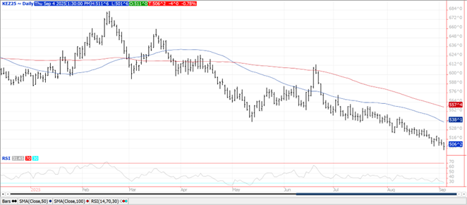 Prices were $.02-$.04 lower across the three classes today with both CGO and KC closing well off session lows. Spreads were slightly weaker. The Dec-25 contracts established fresh contract lows across all three classes on early weakness. With prices hovering near 5 year lows it’s hard to imagine going much lower from here, however speculators remain comfortable being short, while rolling positions forward capturing the wide carries in the market. Higher production estimates in Russia along with strong production prospects in the S. Hemisphere will limit upside opportunities for now. Census exports in July-25 at 85 mil. bu. were in line with the inspections data and up nearly 18% from July-24. Cumulative sales in the first 2 months of the 25/26 MY at 149 mil. bu. are up 19% from YA and the highest in 5 years. The low prices are doing what they are supposed to, stimulate demand. Tomorrow’s export sales are expected to range from 13-25 mil. bu.