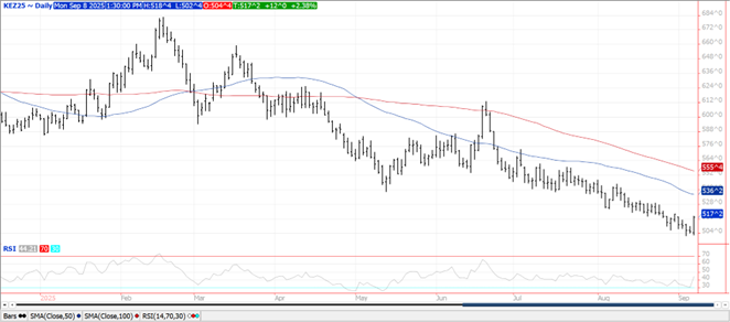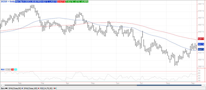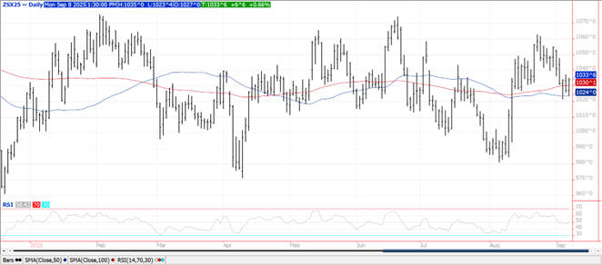 Prices were $.02 ½ – $.04 higher closing near session highs. Spreads also firmed. Dec-25 held support above its 50 day MA at $4.14 ¼ setting up today’s recovery. First resistance is at LW’s high at $4.24 ¾ with secondary support at the 100 day MA at $4.29 ½. Export inspections at 57 mil. bu., were in line with expectations. Inspections for the 24/25 MY were 31.2 mil. with 25/26 inspections of 25.6 mil. New crop inspections are up 35% from YA vs. the USDA forecast of up 2%. The largest takers last week were Mexico – 20 mil., Japan – 11 mil. and Colombia – 9 mil. AgRural estimates Brazil’s 1st crop plantings have reached 12%, below the 15% from YA. APK-Inform raised their Ukraine corn production forecast 2.8 mmt to 30.3 mmt, below the USDA est. of 32 mmt. Friday’s CFTC report showed MM’s were net buyers of just over 19k contracts last week reducing their net short position to 91,487. Index funds were net buyer for a 3rd consecutive week adding 12,633 contracts to their holdings.