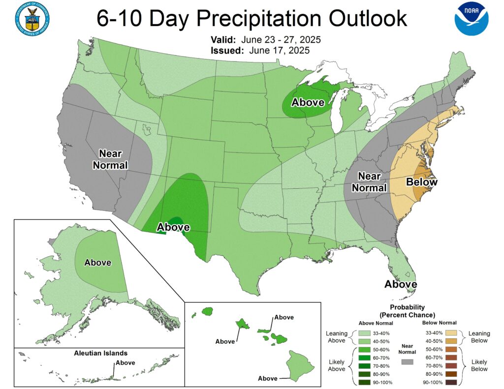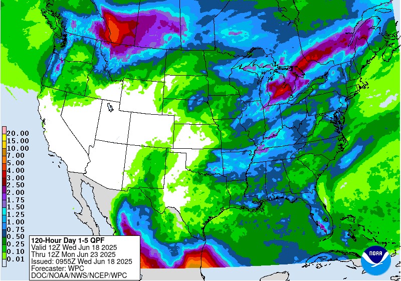 The Grain Stocks and Planted Acreage report will be out at 11:00am CST on Monday June 30th. That is the next major US commodity report that could potentially move markets. Corn exports have been strong, while feed and residual may be reduced for a few reasons. The corn/wheat ratio firmed up a within 50¢/bu in late April giving reason for wheat feed to work it’s way into feed rations. That corn/wheat ratio has since rebounded with reactions to potential trade disruptions in the black sea region. Additionally with the strength of soybean oil, soybean meal has dropped $10/ton and has become more competitive compared to corn regarding feed as well. US weather is favorable for the next 10 days. Nothing in the forecast including the heat tells me to worry about crop growth.
