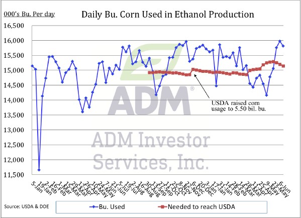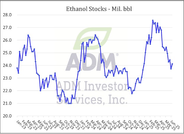 Ethanol Production fell to 1.109M barrels per day for week ending 6-13-25. This was in line with the market estimates and just confirms the USDA estimate of 5.5 billion bushels of corn used is in line.