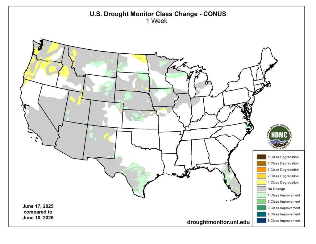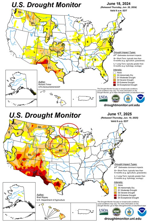 Comparing The Drought Monitor today vs. this time last year, Nebraska and South Dakota are dryer today than this time last year, and northern Minnesota also lacking the moisture seen in spring of 2024.