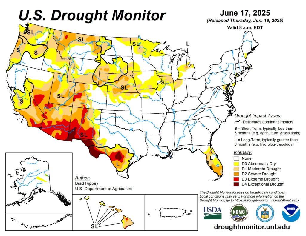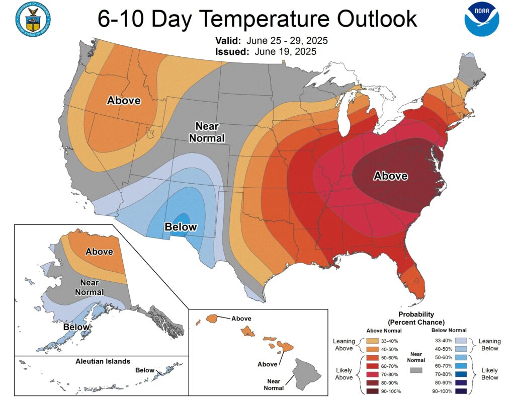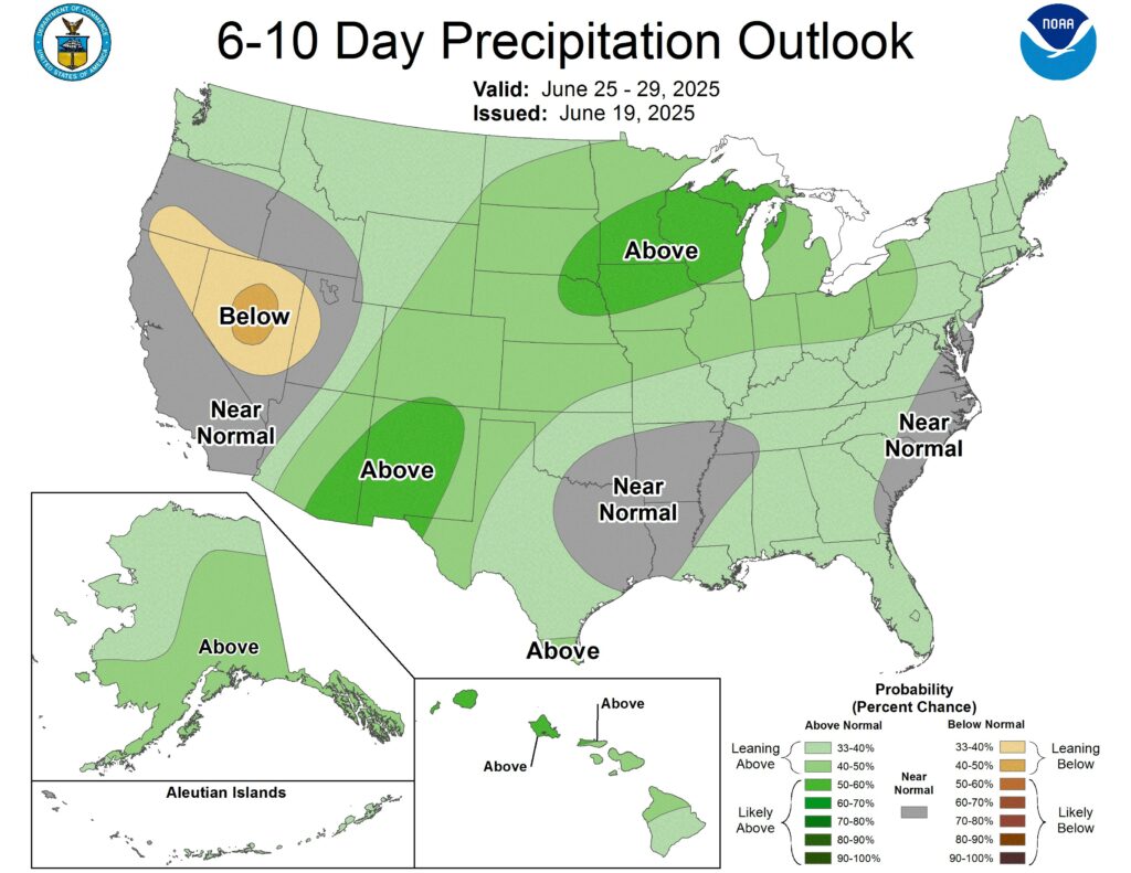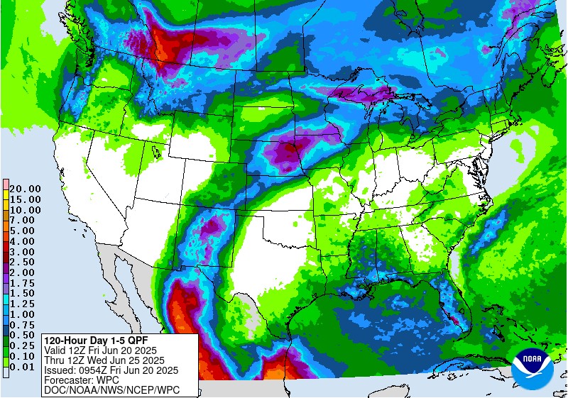 This morning’s export sales numbers were weaker than recent reports, but that is typical for this time of year. Old crop corn, old crop meal and new crop wheat having the strongest presence. The USDA reported a flash sale of 124K MT of corn to unknown destinations this morning for the 24/25 crop year. Despite overall strong corn export demand, due to a large corn crop last year, corn prices are sitting near 2025 lows. Ethanol production is about 5% better today than this time last year. It is hard to catch a rally when most of the US growing areas have seen 1-5 inches of rain in the last 14 days. Most of the recent rains have been concentrated in the mid-south and the lower wheat belt. The northern plains have seen the least rainfall in the last two weeks. I am hearing there is concern about uniform emergence in the northern growing areas due to low temperatures following planting as well as some areas missing rain. the next 7 days should take care of areas in Minnesota, but the Dakotas could still use another good shot of rain before the summer heat hits. Heat is spiking this weekend, but many believe it will be good for the crops to feel some stress to lock in root growth. Max temps this weekend will hit over 100 degrees in Nebraska and parts of southern South Dakota and western Iowa. This temperature spike will be somewhat short -lived, in the northern plains, seeing max-temps will drop back down to 75 degrees by Tuesday/Wednesday. The rest of the Midwest and southern regions will continue to see upper-80s and 90 degree temps all next week.