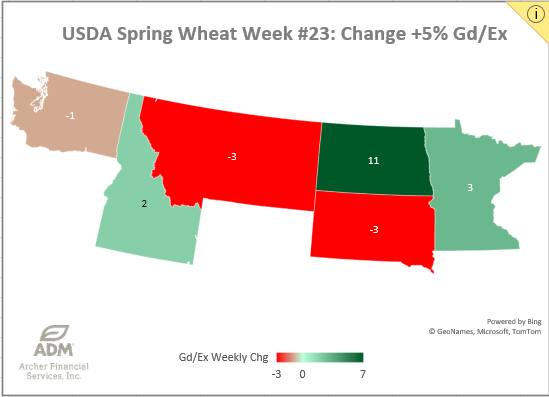 US Spring Wheat Crop Conditions landed at 50% good/excellent, that’s +5% better than last week. Montana, North Dakota and South Dakota are still about 30% below their conditions this time last year. Minnesota is running about 10% better than this time last year. biggest change week-over-week is North Dakota’s +11% improvement. This week’s ratings are the 2nd lowest in the last 10 years.