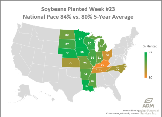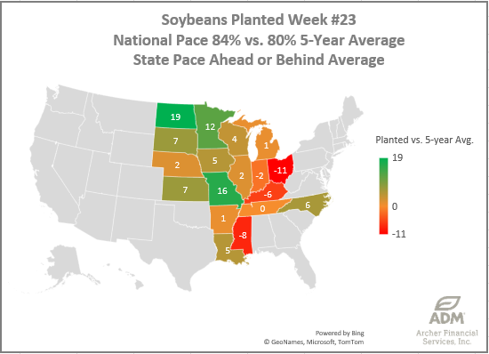 Soybean Planting Progress is +4% faster than the 5-year average. Progress advanced 8% to 84% now. The eastern states (Ohio, Kentucky, Indiana) have fallen behind the 5-year pace. Soybean final planting dates are within the first week of July in Ohio.