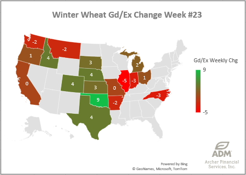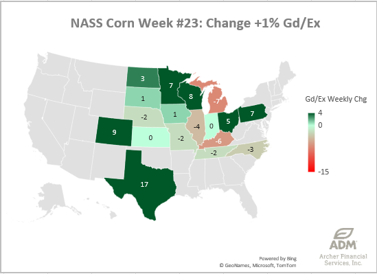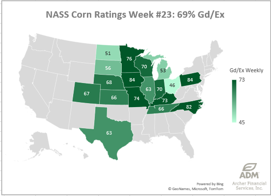Corn Good/Excellent Ratings were +1% better week-over-week, now at 69%. This week’s biggest losers were Michigan, Kentucky and Illinois, while Minnesota, Texas, Ohio, and Wisconsin were able to move the needle to the positive.