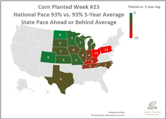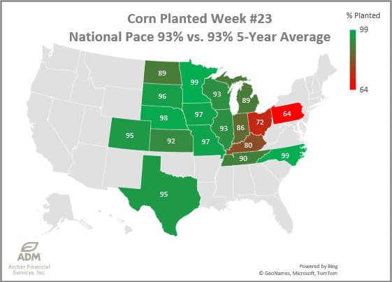 Corn Planting Progress was finally caught by the 5-year average, now matching it at 93% planted. Progress advanced 6%. The western half of the US growing region is ahead of pace and the eastern states are all behind pace. Ohio is in the worst position for both corn and bean planting progress.