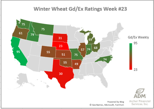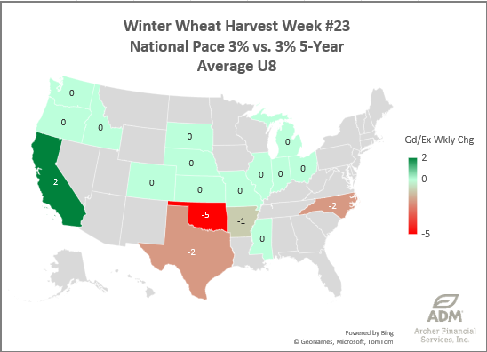 Winter Wheat Harvest Progress is on pace at 3% nationally, but Oklahoma, Texas and Arkansas are all behind the average pace to start harvest. While most states are just getting started (below 10%), Texas is 25% done as of today.