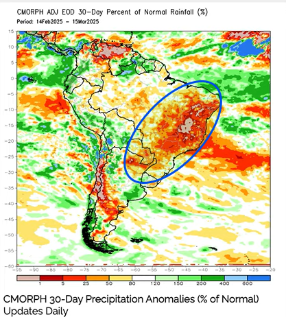 Percent of Normal Precipitation for South America shows the eastern growing regions have experienced drier than normal weather and NDVI levels in these areas are below the 20-year average range. Brazil’s soybean crop is 70% harvested, but the 2nd corn crop may be in jeopardy due to this dry pattern.