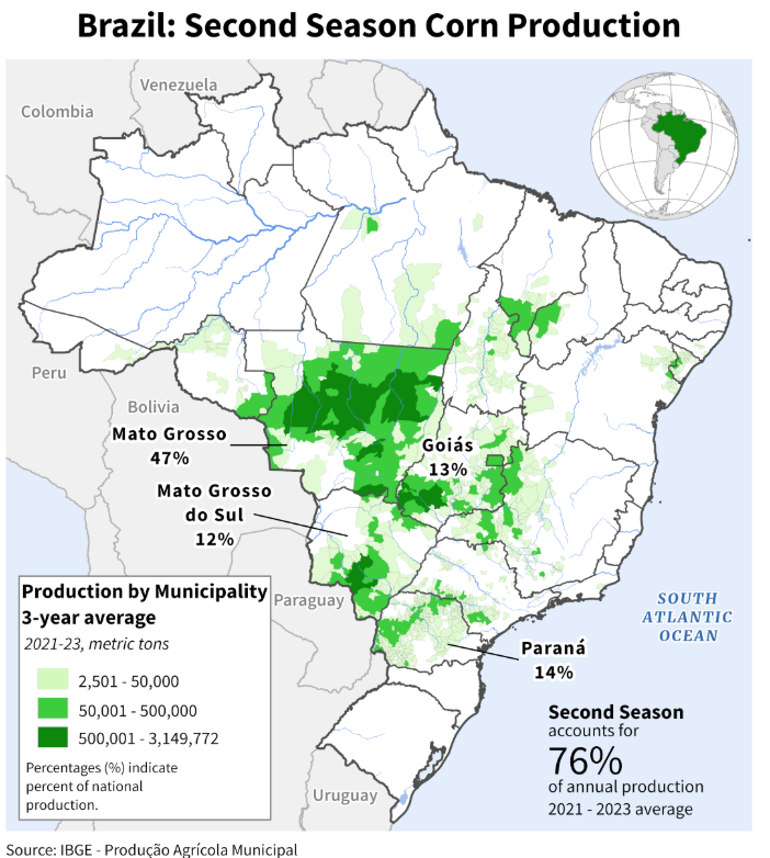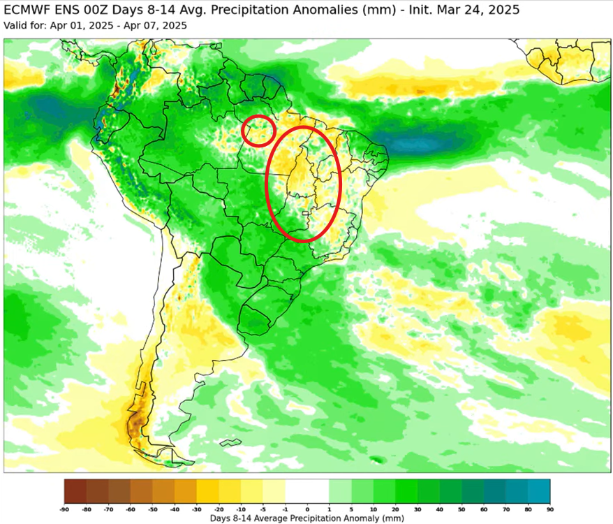 Precipitation Anomalies for the First 7 days of April has some of the northeastern Brazilian 2nd corn crop growing regions expecting lower than normal precipitation.