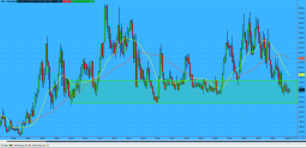Nearby Soybean Meal is trading near a support shelf that spans from 2010 to to today.