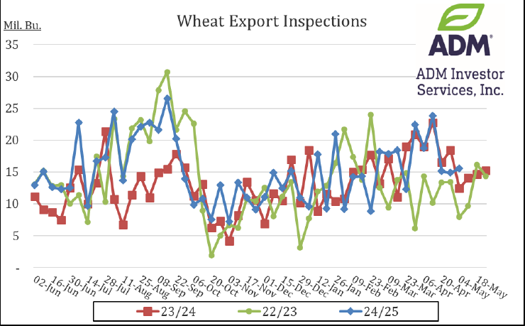 Ag Fundamentals: This morning there was a flash sale of 125K MT of soybean meal to the Philippines. Corn export inspections were reported this morning at the higher side of the estimate range at 67.7 million bushels. That is a big jump from the corn inspections last week at just above 50 million bushels. only 48 million per week needed to reach the USDA corn export year end estimate. Soybean export inspections were below expectations are 8 million bushels and below the 13 million needed per week to hit the USDA’s expectation. Wheat export inspections were in line with the estimate range at 16 million bushels. On Friday’s CFTC Commitment of Traders report, we saw managed money corn position flip negative for the first time since November 2024, and the largest short position at -85K contracts in over 7 months. Weather and planting progress are still the main focus in the US but a large position change like that is always important to keep in mind. In the US, farmers have finished planting 78% of corn intentions, and 66% soybeans. Corn is 5% ahead of the 5-year average pace and soybeans are 13% ahead of schedule. Winter Wheat conditions dropped -2% from 54% last week to 52% this week. Rains will continue to hit most of the wheat belt for the next 5-7 days.