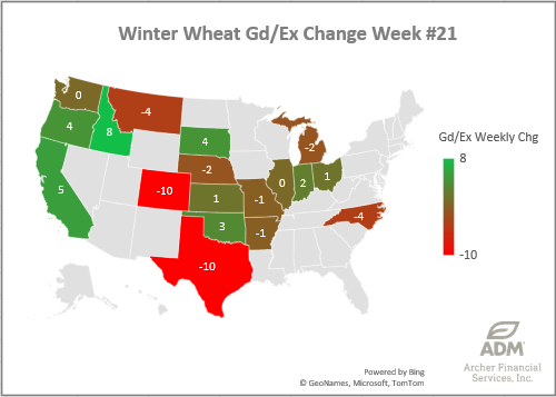 Winter Wheat conditions dropped -2% week-over-week to 52% good/excellent.