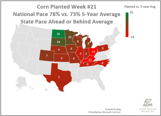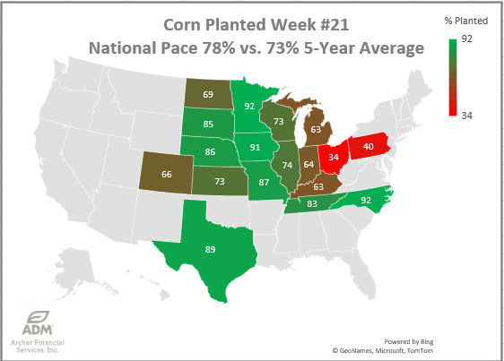 Corn Planting has reached over 78% complete following today’s crop condition report. Ohio and Kentucky are in the worst shape as they fall double digits behind pace. Still the country overall is +5% ahead of schedule.