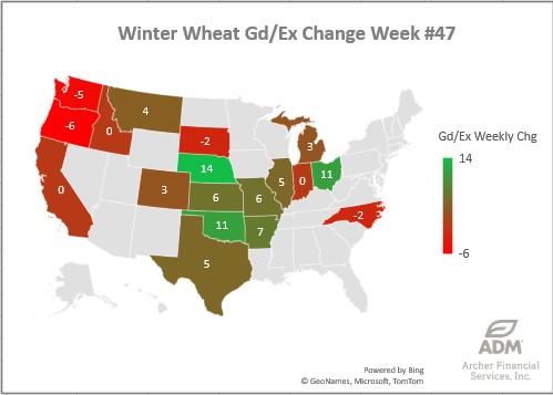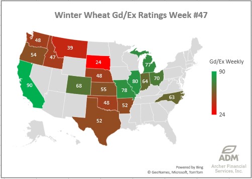 Winter Wheat Crop Conditions are +6% better than last week’s good/excellent numbers. Ohio, Nebraska and Oklahoma improving double digits, while Kansas, Missouri, Arkansas and Illinois all jumped 5% or better as well.