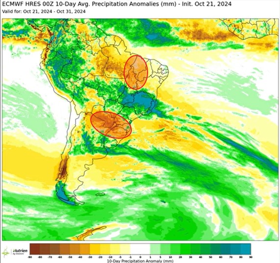 The 10-Day Precipitation Anomaly Map is showing above normal rainfall in the majority of South America’s growing areas. The Areas circled in red are at risk of drier than normal rainfall.