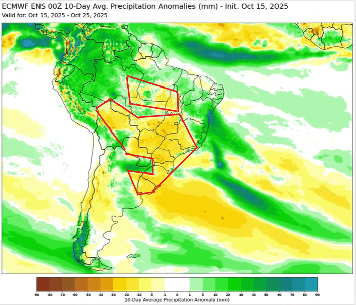 European Model for the next 10-Day Precip Anomalies shows dryer than normal weather creeping into Brazil’s main growing regions.