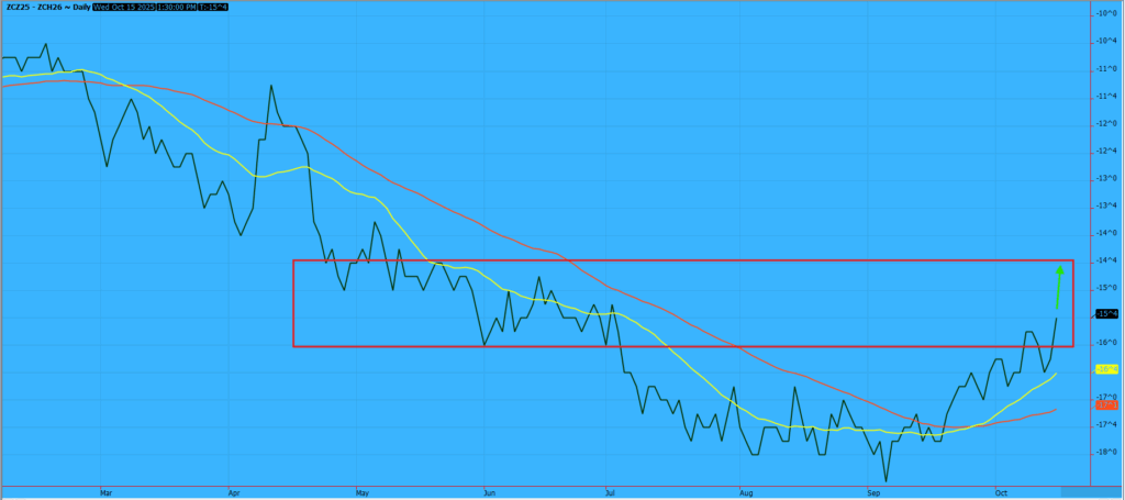 Corn CZ-CH Head-Fake? Strong export sales to Mexico and continued ethanol margin returns to the processor may have brought the current CZ-CH spread 3 cents firmer, but a large and quick harvest is expected to keep a cap on continued strength. This spread may have a another penny or two to the upside, but i believe on-farm-storage can only keep the bushels away from the market for so long. I would call the red box below the “sell zone”.