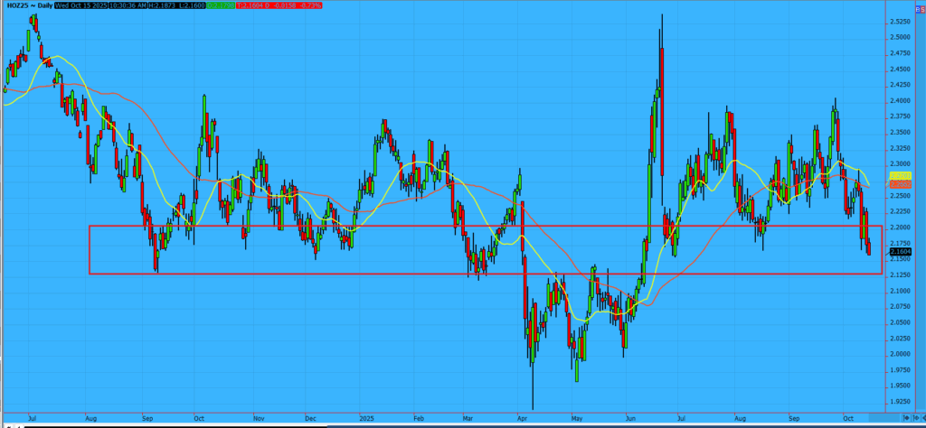 December Heating Oil entered the “buy zone”, looking at the chart support form the last year of trading. Excluding price action from April-June, this has typically been a solid support zone for HO.