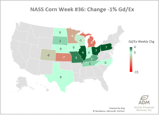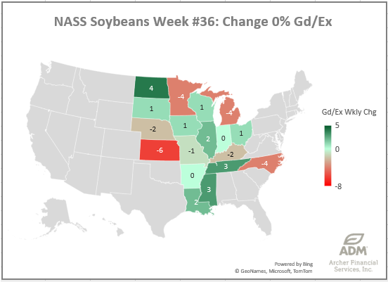 The NASS Crop condition ratings and changes from the previous week are pictured below. Soybean good/excellent ratings are unchanged at 65% and corn is -1% down from last week. The 30-40 day forecasts for South America are showing signs of hope that October will be wet enough to get the soybean crop planted on time. They won’t have an very early plant, but typically South American farmers only put about 10% of their seeds in the earth by the first week of October anyway. There are plenty of days between now and crunch time. October is an important month. 80% of the planting activity in Brazil takes place in October.