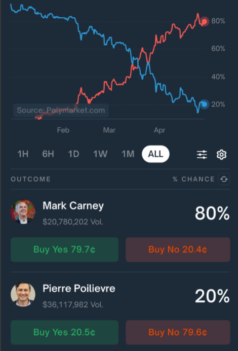 Canadian Prime Minister Election Odds according to Polymarket. Pierre Poilievre in blue and Mark Carney in red.
