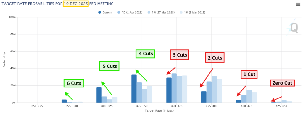 LThe December 10th 2025 Fed Probability Bar Chart in the last two days has increased the chance of the number of federal interest rate cuts from 2-4 cuts to 3-5 cuts between now and the end of this year. Jerome Powell expected to speak on economic outlook today around noon.