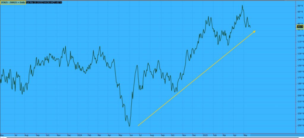 The July Corn/Wheat Spread has firmed from -$2.50 in June to -85¢ today. The spread firmed up to -50¢ in late April.