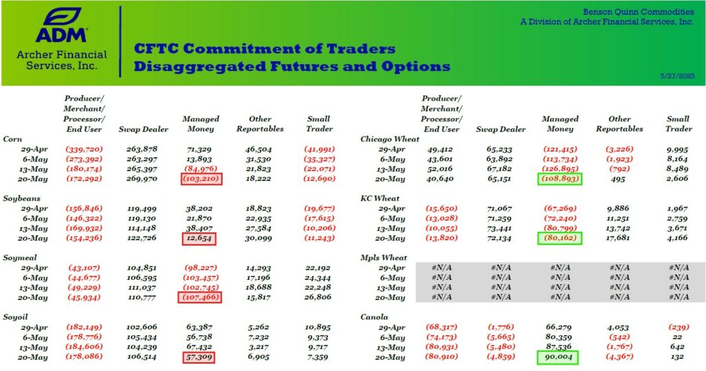 The CFTC Commitment of Traders Report on Friday had Managed Money selling corn and the soybean complex while they were net buyers of wheat an Canola. Soybeans had the last move lower on their positions as news of the biofuel policy in Washington was pushed back further than expected while planting progress and spring weather has been favorable. The MM corn position has made the biggest move since the beginning of this year. Their position has moved over 450K contracts from long +350K to short over 100K contracts. Corn export demand and consistent usage for ethanol is not enough to rally futures. The weight of a potential bummer crop can be felt when looking forward at corn supply. Crop progress report will be out later this afternoon. Most of the US growing regions were hit with some precip over the last 14 days and the next 7 has rain focused on the mid south and delta regions. Planting progress should wrap up in many northern and central areas by this time next week. The crop progress report will also include crop conditions for corn and spring wheat in this afternoon’s report.