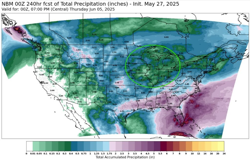 7 Day Precipitation: Midwest producers will have a wide open window over then next 7 days to finish up planting.
