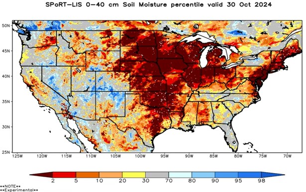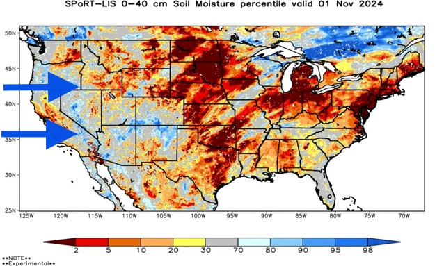 Wednesday Oct 30th Soil Moisture Map was showing poor conditions but may be cured with recent and expected rains between now and mid Nov
