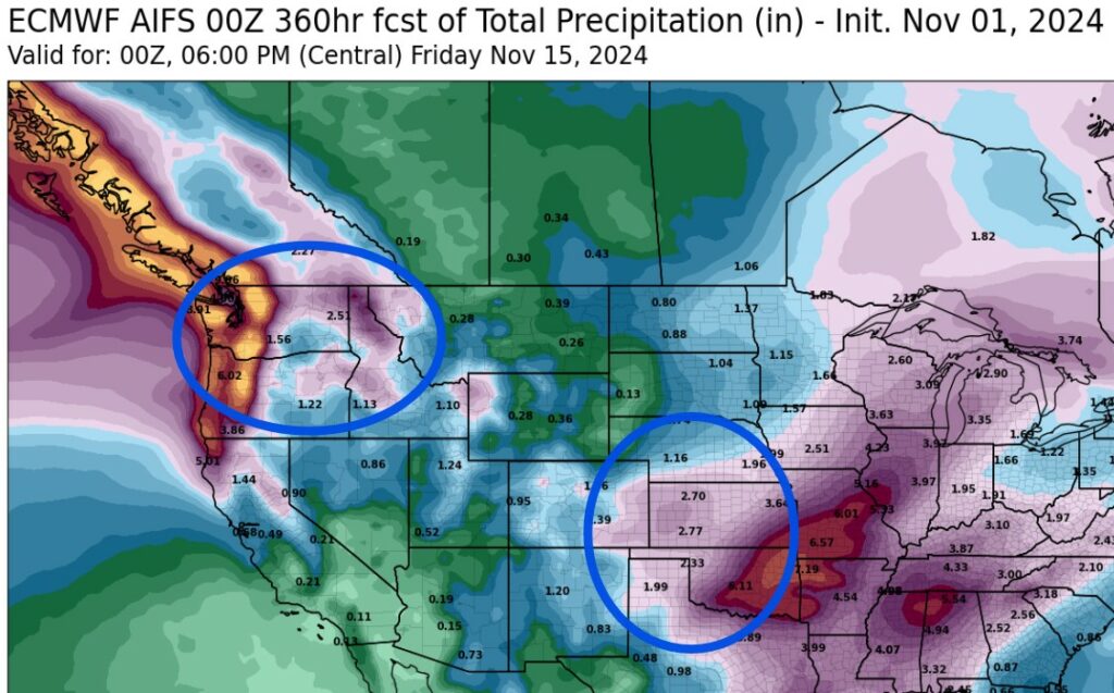 Rain over the next 15 days should solve most of the winter wheat condition issues as well as improve the soil moisture and river levels. Expect a chilly weekend with temps raising back up to mid 60s by Monday in the Midwest.