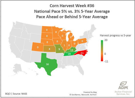 The Crop progress report stated we are 5% into the 2024 corn harvest. Texas at 75%, Tennessee at 31%, Kentucky at 22%, Kansas at 14% and Missouri at 13% harvest. Illinois was pegged at 2%, but I was seeing a lot of green left out in the fields last week while i was driving around northern Illinois. Most of the country is expected to be warm and dry over then next few days. parts of the Midwest may see some rains this weekend depending on how far up the valley Francine reaches.