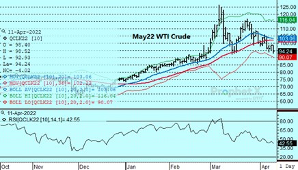 The petroleum complex traded on the defensive despite increased likelihood that the bulk of the EU will ban additional imports of Russian oil as international sanctions are ramped up for their invasion of Ukraine. The pressure, which saw WTI decline by as much as 5 dollars to a low of 92.93 basis May, reflected a combination of concerns linked to SPR releases, Chinese lockdowns, expected expansion of crude output in areas outside OPEC+, and continued entreaties by the EU to urge OPEC to expand production.