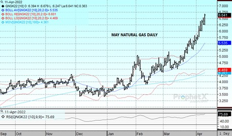 Once again the pullback was short-lived as the May contract gained 36 1/2 cents today to settle at 6.643. The undercurrent of support continues to be provided by the war in Ukraine and the fallout from Europe’s plans to wean itself off Russian energy as increased sanctions become more likely each day. Weather has added to the upside bias, as US forecasts point to below normal temperatures on average for the second half of April. The slow growth in production continues to be a price driver as well, as it becomes more difficult to adequately rebuild supplies by the fall if marked improvement isn’t seen soon. Output did reach 95 bcf/d over the weekend, and with rig counts showing improvement it would appear that production increases are in the pipeline if crews can be found. The market remains overbought as RSI went back above 80 percent today, and we continue to expect a near term retracement that should find solid support near 6 dollars. A return to the upside finds the charts void of any resistance until the psychological 7-dollar level.