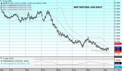 After a feeble attempt to follow through to the upside early in the session, prices worked lower the rest of the day to settle with a loss of 9.3 cents at 2.093. A lack of any excitement from the weather models kept the reality of current ample storage and lackluster demand front and center. Tomorrow’s storage report should mark the end of the withdrawal season, with an injection of 28 bcf expected, which is in line with the 5-year average. LNG exports remain the underlying supportive factor, as recent record flows above 14 bcf/d offer hope that the supply glut can be whittled away if we can get some above average cooling demand as we start the summer. Today’s weakness brings the 2-dollar support level right back into view, with a violation of that area leading to a test toward 1.80. The 20-day moving average, currently at 2.254, is a key resistance level that will need to be taken out to have any hope of flushing out fund short covering.