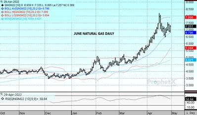 Prices have gyrated over the last two sessions, with a loss of 45 cents yesterday followed up by a rebound of 36 cents today as the June ended the week at 7.244. Spillover from overseas price weakness pressured values yesterday, as Russian gas continued to flow West despite tensions over payment in rubles. The storage report added selling pressure, as the 40 bcf build was construed bearishly despite it bringing total stocks back to more than a 300 bcf deficit to the 5 year average. The underlying driver of price strength contines to be US production levels, as the slowdown from last weekends late season blizzard conditions in the Bakken region shut in more gas at a time when output had already been floundering verses expectations. LNG flows remain inconsistent, dropping below 12 bcf yesterday, but all signs point to a return to full capacity this summer after maintenance is complete. The 7.50 level remains initial resistance, with not much beyond there to slow a rally until the 8 dollar area. Any pullbacks should find considerable support near 6.80, and if that doesn’t hold the market could test all the way down to 6.50.