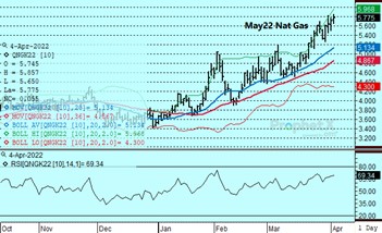 The scope for a European embargo on Nat Gas appeared to increase following reports of Russian war crimes in Ukraine this past weekend. The rising sentiment to embargo Russian shipments into Europe appeared to help underpin price levels with values reaching new highs for the move of 5.857 basis May Nat Gas before retreating on weaker US demand expected and higher gas production. Near term, we look for modest resistance to develop above the 5.80 area reflecting milder weather conditions into mid-April and lower HDD for the US. The strength to the US economy along with uncertainty over European valuations should limit any large scale breaks on seasonal considerations into May to near the 5.20 area unless a major break in Russian tension occurs. The prospect that Europe will do all they can to reduce reliance on Russia for their Natural Gas supply not only in the near term but also in the longer term continues to advance ideas that export levels will continue to increase and steadily tap US supply availability. Given the strength of prices overseas, the US is already exporting as much as it can due to export constraints which could limit upside for now as export capacity is ramped up as new facilities and pipelines are built with the intent of supplanting Russian supplies eventually.