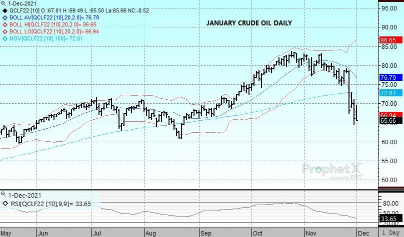 Given the wide scope of issues to be considered on a macro level it is not surprising that the DOE report had little impact. The report continued to indicate low inventory levels, with commercial crude stocks declining by .9 mb despite a release from the SPR of 1.9 mb. Offsetting the decline in crude was the rise in product stocks, with gasoline rising by 4 mb and distillate increasing by 2.2. Surprisingly the cracks strengthened despite the report and increase in refinery utilization to 88.8 percent compared to 78.2 last year and 91.9 percent pre-Covid. From a price standpoint, it looks like 65.00-66.00 basis January crude remains a key support level while resistance likely rests near the 75.00 area, which had been support before Friday’s sharp break.