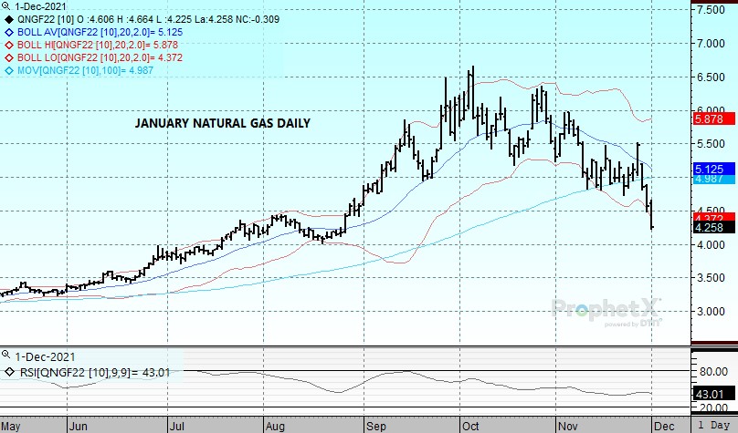 The market continued to struggle as the January contract settled at 4.258 for a loss of 31 cents on the day and 1.20 for the week. Weather continues to be the issue as overnight revisions removed another 36 bcf in demand from the 15-day forecasts, with December now expected to produce the second lowest HDD total in the last 20 years. Estimates are pointing to overall storage moving into a surplus to the 5-year average by mid-December. Tomorrow’s report is expected to show a 57 bcf withdrawal verses the 5-year average decrease of 31. The 4.50 support held up for one day, and with the poor close the market now looks determined to test the 4.00 level near term. The 4.50 level now becomes the first level of resistance on a recovery from the overextension on the downside.
