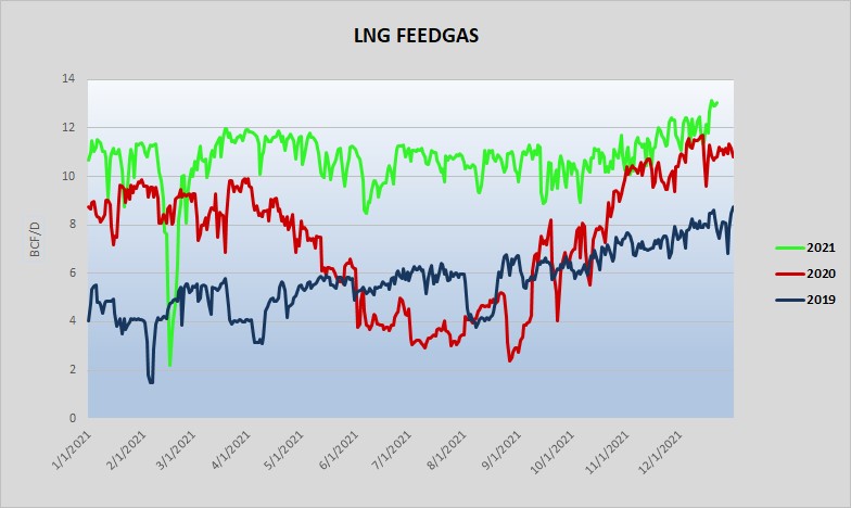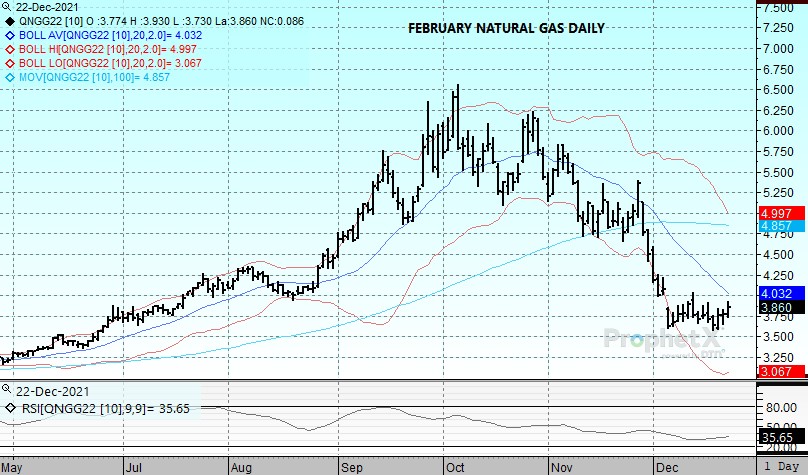 The natural gas market managed to settle higher for the third straight day as the February contract ended the session at 3.86 for a gain of 8 1/2 cents. The below normal temperatures predicted in the first week of January held up in the most recent forecast revisions, and the market seems willing to overlook near term warming in favor of the potential for the first true cold spell of the season. Prices are also being underpinned by the situation overseas, where European values have spiked to all time highs as Russian gas flows through the Yamal pipeline actually reversed over the last few days as the Kremlin continues to play games while feigning innocence as they attempt to pressure the approval of Nord Stream 2. The result of record high overseas prices continues to be reflected in US LNG flows which are hovering around 13 bcf/d, near capacity with no slowdown in sight. The market still has to digest what is expected to be a very negative storage number this week (estimated 56 bcf withdrawal verses 5-year at 153), but with all the risk premium extracted with the break from late November, most of winter still ahead of us, and overseas prices at huge premiums, the 3.50 level looks like solid support. The 4.00 area likely holds up to any further strength until a clearer picture of the early January cooling comes into view.