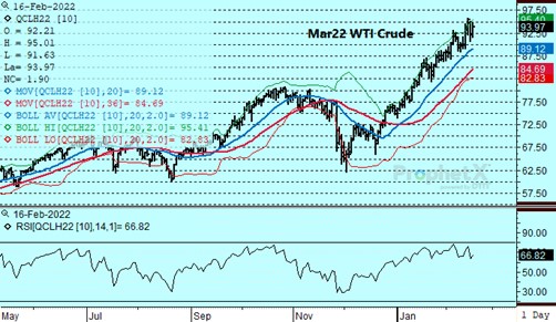 Prices rose toward the 95.00 level basis March WTI before retreating late in the session. Conflicting statements with respect to Russian actions near Ukraine continued to exacerbate a volatile trading environment, with yesterday’s announcement of small troop withdrawals countered by analysts suggesting there were signs that Russia was continuing its troop build-up. Potential for sanctions on Russian exports by Western powers continues to prompt a sense of nervousness toward global energy supplies. The DOE report had little impact on the market as any negative reaction to the larger than expected build was offset by ongoing declines in stocks at Cushing along with strong rates of disappearance. Generally ignored was the resumption of Iranian negotiations toward the lifting of sanctions.