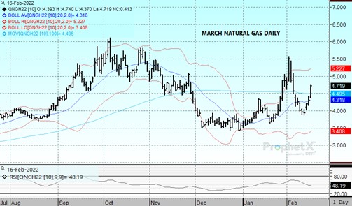 It appears as though the reports of winter’s end have been greatly exaggerated. The switch toward a colder trend into late February that we started to see early this week has continued to strengthen, with this mornings runs adding 40-50 bcf of demand to the 15 day forecasts. The turnaround has forced trade to reestablish some risk premium that it so willingly threw away over the last two weeks. Add to that some winter storm potential for the central and eastern US in the next 10 days and the magnitude of the buying is not surprising considering the possibility of increased demand and production shut-ins. Estimates for tomorrow’s withdrawl are in the 193 area compared to the 5 year average at 154. The market retraced 50 percent of the early February break, and the close near the highs likely signals followthrough that would target a 68 percent retracement in the 4.93 area. Once again the speed of the move higher has amplified the downside risk if the cooling trend reverses, with 4.50 the initial area of support.