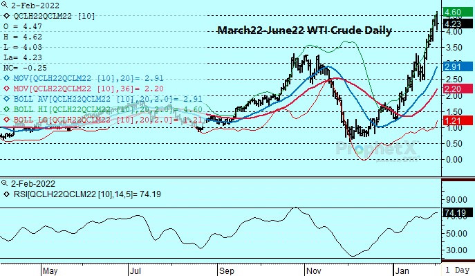 The petroleum complex traded on both sides of unchanged today. Early strength that saw values approach the 90.00 level in March lacked follow-through after reports that OPEC+ will stick to planned production increases of 400 tb/d despite entreaties from top oil consumers to ramp up output at a quicker pace. In addition, the market failed to respond to the DOE report which showed a draw in crude inventories of 1 mb against expectations for a million-barrel increase. The report continued to reflect resilient demand amid current high prices and low inventories. The fallback in values from the highs saw an associated decline in the backwardation with the spread moving from 4.62 premium March into 4.03 on an intra-day basis. The weakness might be the first sign that inventory tightness is easing as we move through the 1st quarter as the IEA had suggested in their January Monthly Report. Subsequently compliance rates of OPEC+ will be watched closely on whether they are regaining production capacity following recent shortfalls.