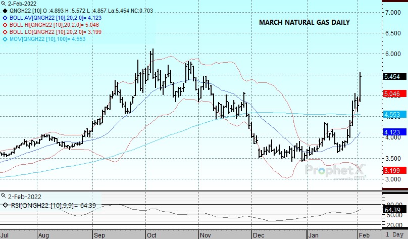 After an easing of prices yesterday that coincided to a brief stint of warmer temperatures across the US, the market returned to its upside push as Winter Storm Landon rumbled across a large swath of the country from Texas to Maine, leaving heavy snow, ice, and cold temperatures in its wake. The March contract ended with a gain of 75 cents at 5.501. With a heightened concern for freeze-offs, production was already showing signs of decline today, with early runs indicating a drop to 90.5 bcf/d compared to yesterday at 93.5. These rates will be watched closely as the week progresses, and also after the cold spell has passed into this weekend to see how quickly they recover. Tomorrow’s storage report is estimated to show a 277 bcf decline, sharply above the 5 year average of 150. With some colder temperatures now being signaled in the back half of the 15 day forecast, the possibility of 6 straight weeks of 200+ draws has emerged. The trade above 5.50 today has opened the potential for a run to the October highs above 6.00. Any talk of less than expected fallout from the storm over the remainder of the week could lead to a quick pullback that would find little support before the 5 dollar level, and beyond that all the way down to the 100 day moving average near 4.55.
