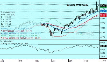 The petroleum complex traded sharply higher but ended well off levels reached in the overnight session. Strength was linked to additional sanctions on Russia, which included prohibiting transactions with their Central Bank and Sovereign fund. Prospects that Russia will face severe disruptions to its exports of commodities including oil, strategic metals such as palladium and nickel, and grains following the cut-off of some banks access to the SWIFT International Payment system encouraged strong buying interest in crude and products. Tensions were also heightened by President Putin putting their nuclear deterrent on high alert as negotiations began with Ukraine at the Belarussian border. Reports that Russian forces had seized two small cities in South Eastern Ukraine were counter balanced by reports of stiff Ukrainian resistance in other areas. The uncertain future for Russian oil production remained in the background as sanctions and the exodus of Western oil companies raised questions over longer-term investment. Offsetting some of these concerns was the potential for demand destruction and quicker substitution of renewable energy sources.
